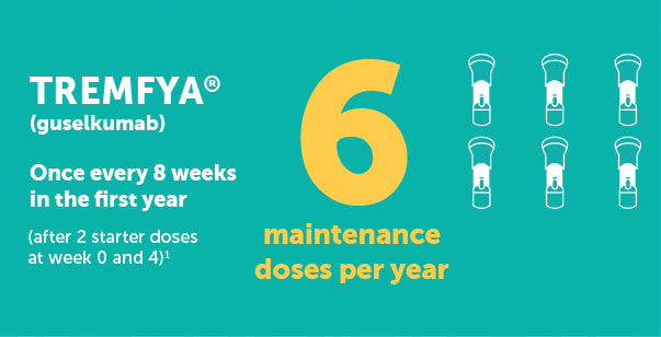 A single, 100 mg dose every 8 weeks after only 2 starter doses. The recommended dose of Tremfya® is 100 mg by subcutaneous injection at Weeks 0 and 4, followed by a maintenance dose every 8 weeks